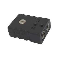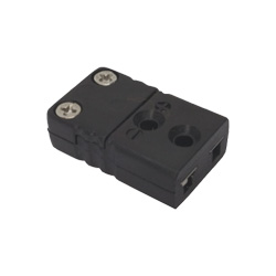 A1 Type J thermocouple connector, miniature flat pin jack, 200 deg. C, glass filled thermoplastic body, black, thermocouple material pins, 40 AWG (0.08mm) to 20 AWG (0.8mm) wire size range.