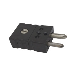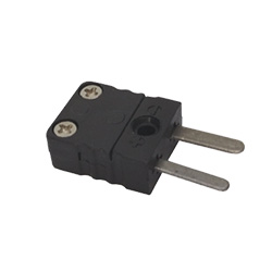 A1 Type J thermocouple connector, miniature flat pin plug, 200 deg C, glass filled thermoplastic body, black, thermocouple material pins, 40 AWG (0.08mm) to 20 AWG (0.8mm) wire size range.