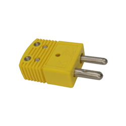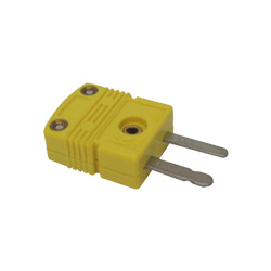 A1 Type K thermocouple connector, miniature flat pin plug, 200 deg C, glass filled thermoplastic body, yellow, thermocouple material pins, 40 AWG (0.08mm) to 20 AWG (0.8mm) wire size range.