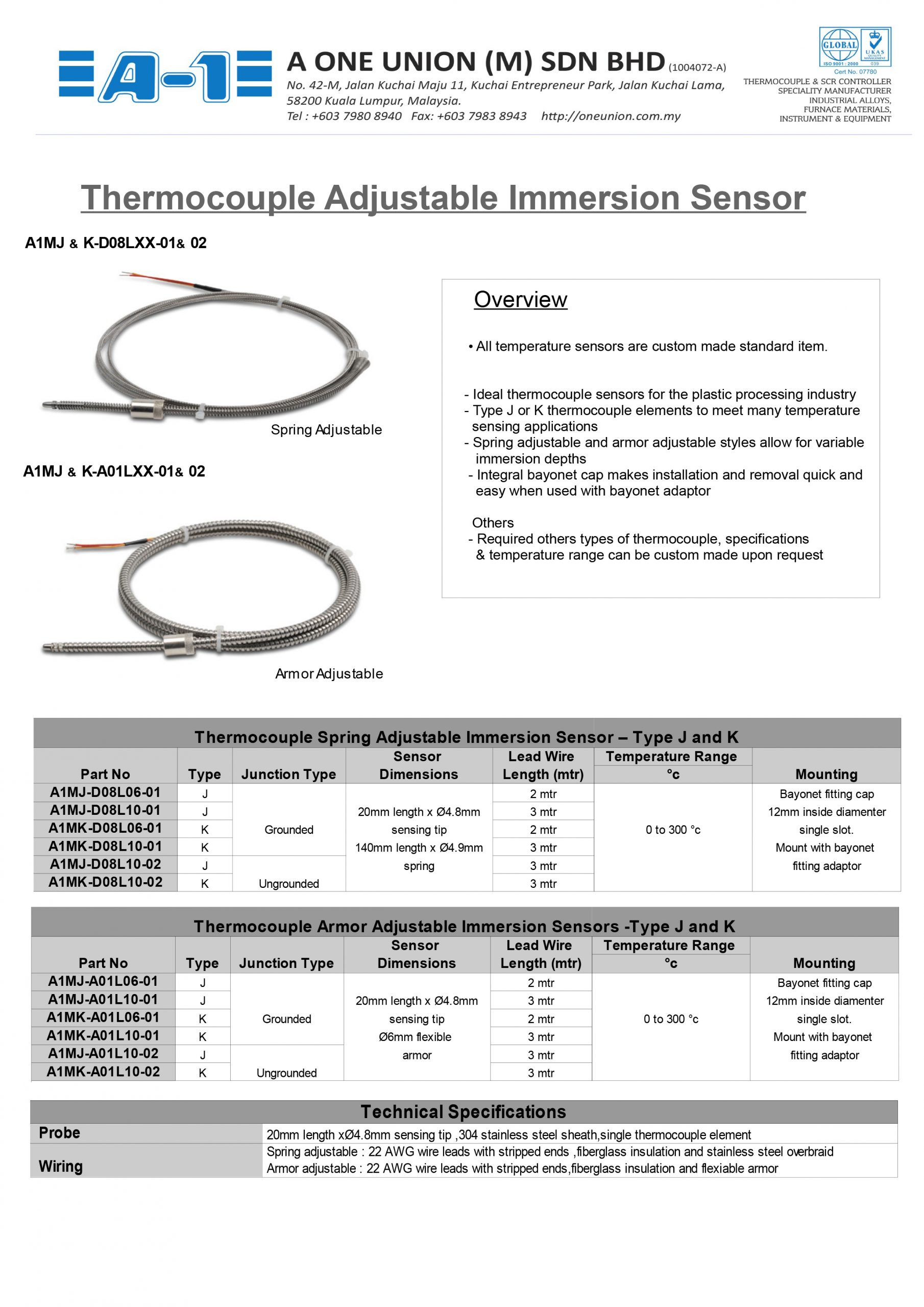 A1 temperature sensor, Type J thermocouple, spring adjustable immersion probe, grounded, 20mm insertion length, 4.8mm probe diameter, stainless steel sheath, bayonet cap process connection, 3 meters 24 AWG wire leads.