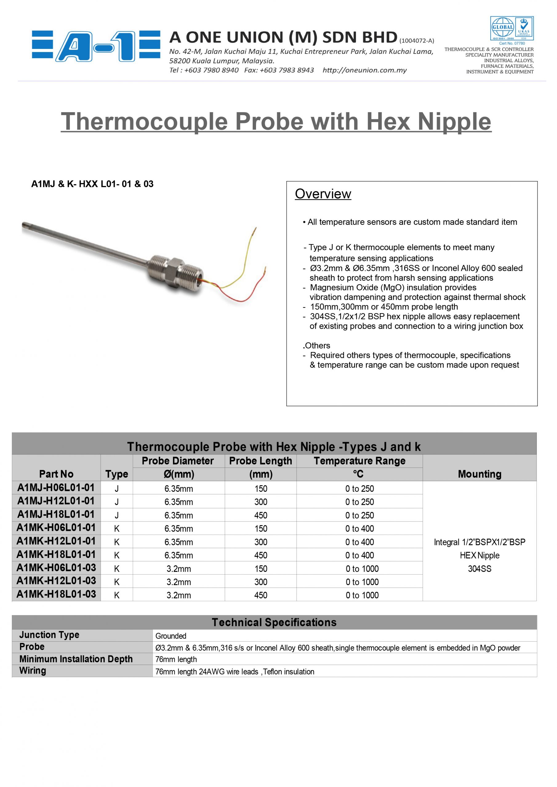 A1 temperature sensor, type J thermocouple, hex nipple probe, grounded, 450mm insertion length, 6.35mm probe diameter, stainless steel sheath, 1/2in male BSP process connection, 1/2in male BSP with 76mm 24AWG wire leads.