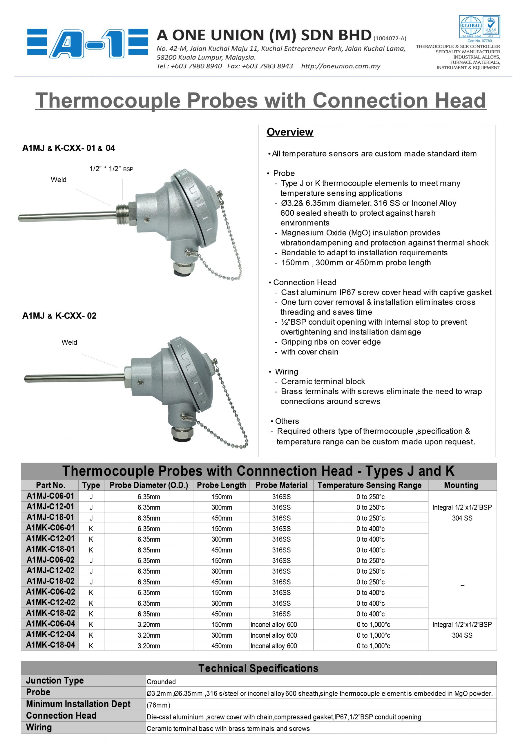 A1 temperature sensor, Type K thermocouple, connection head probe, grounded, 150mm insertion length, 6.35mm probe diameter, stainless steel sheath, aluminum screw cover head with terminals.