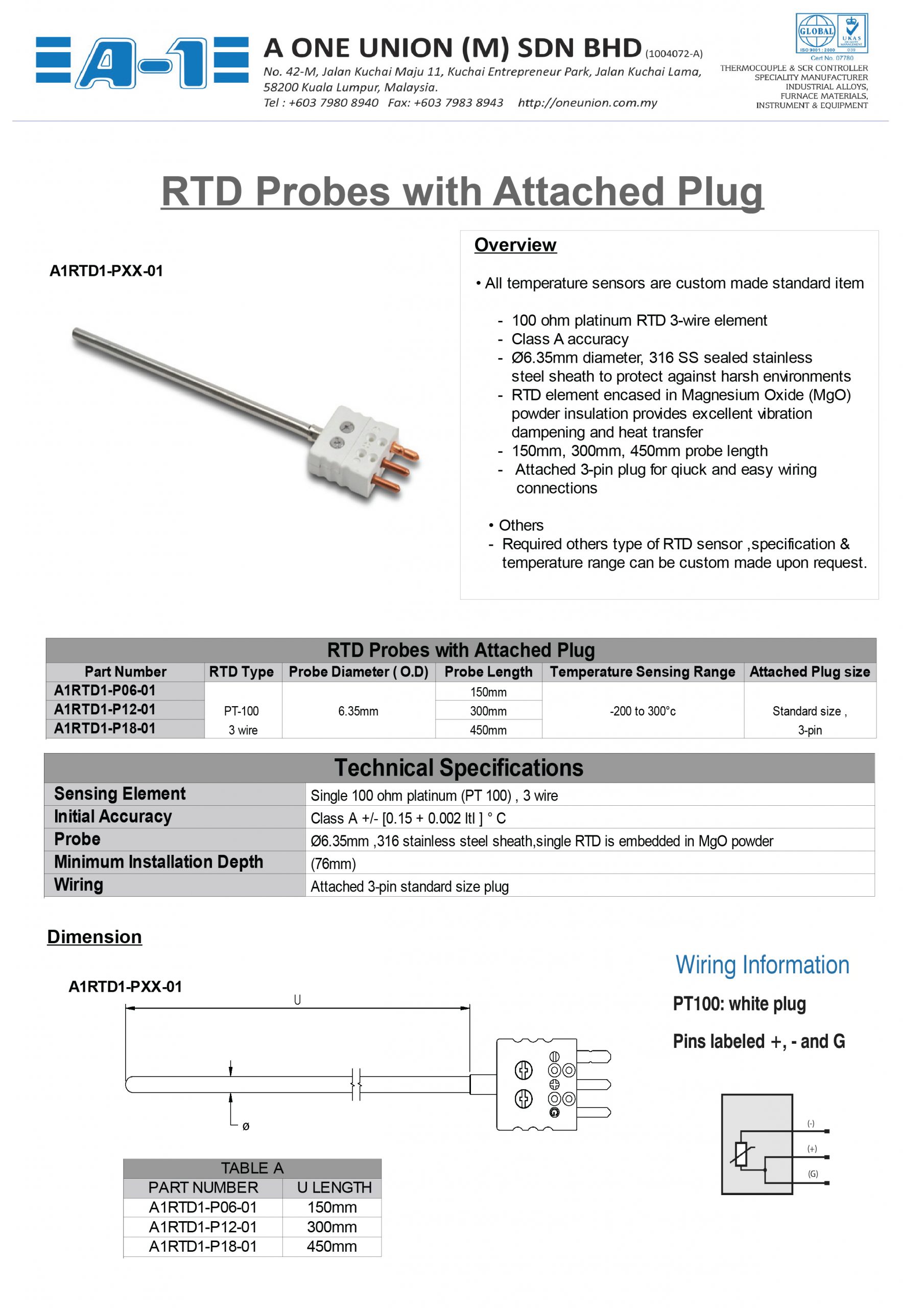 A1 temperature sensor, Pt100 RTD, attached plug probe, 150mm insertion length, 6.35mm probe diameter, stainless steel sheath, 3-pin standard size plug.