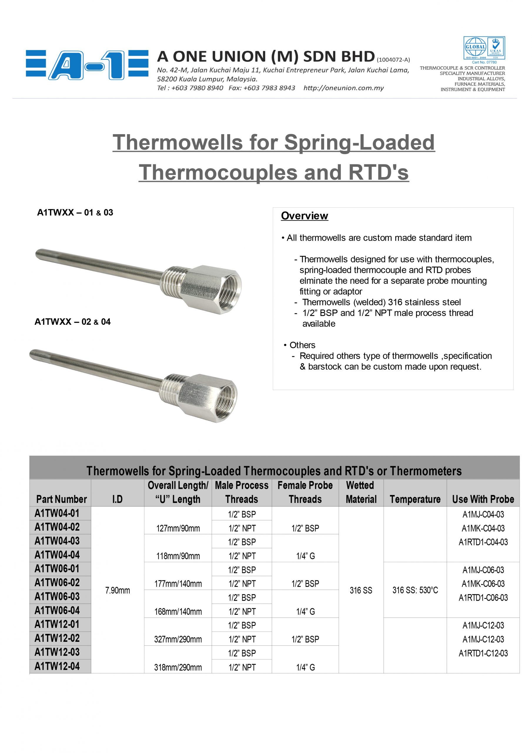 A1 thermowell, 1/4in G female probe connection, 1/2in male NPT process connection, 316 stainless steel body, 168mm overall length, 7.9mm bore.